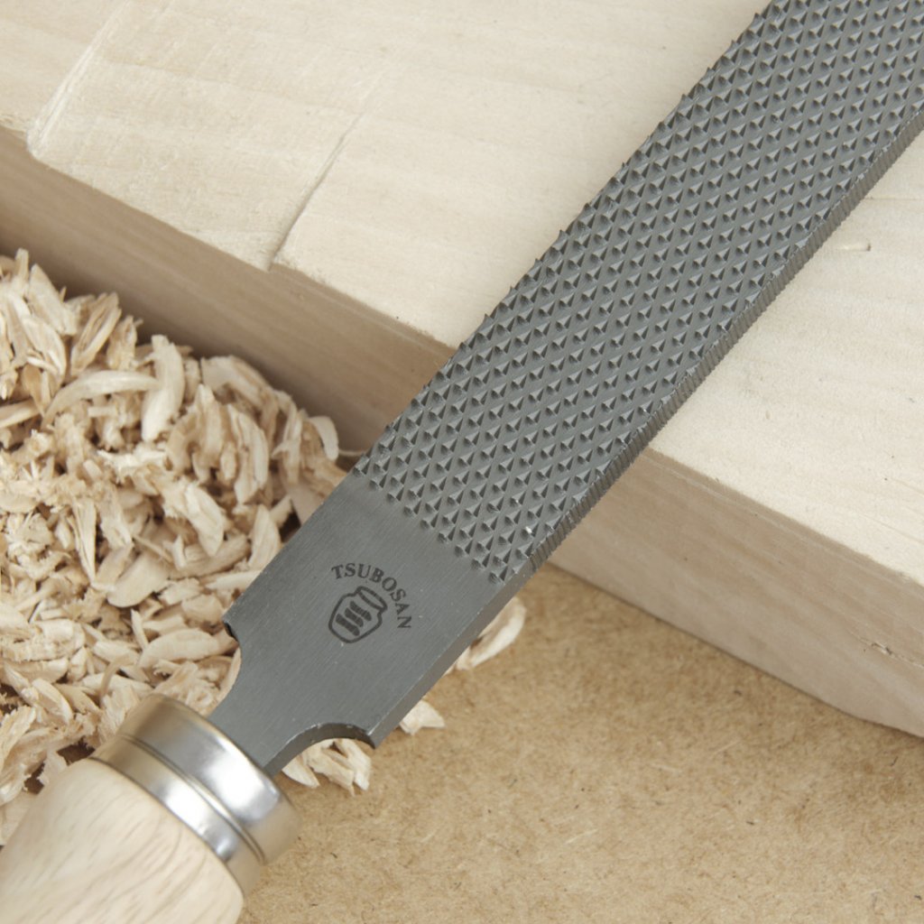 Japanische Flachfeile für Holz mit 3-seitig gezahnter Klinge. Unterschiedliche Grobheit an den Feilenseiten. Traditioneller Holzgriff mit Metallhülse. Feilenlänge 330 mm. Konzipiert für die Arbeit mit Holz.